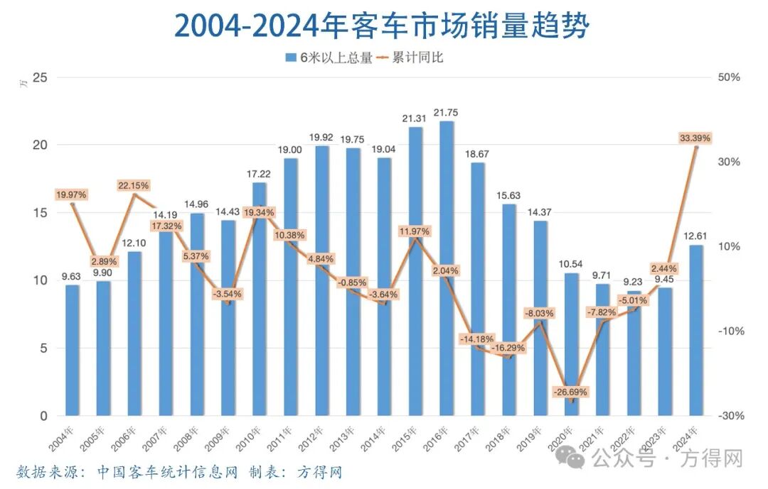 中国客车市场正在走出谷底,位于上升周期! 根据中国客车统计信息网数据,2024年,客车市场(行业重点关注的27家企业)累计销售6米以上客车126064辆,同比增长33.4%,增速达到20年新高! 其中,既有旅游经济强势复苏因素,座位客车增长34.73%;也受益于“以旧换新”政策拉动,公交客车再次接近6万辆、增长33.38%。