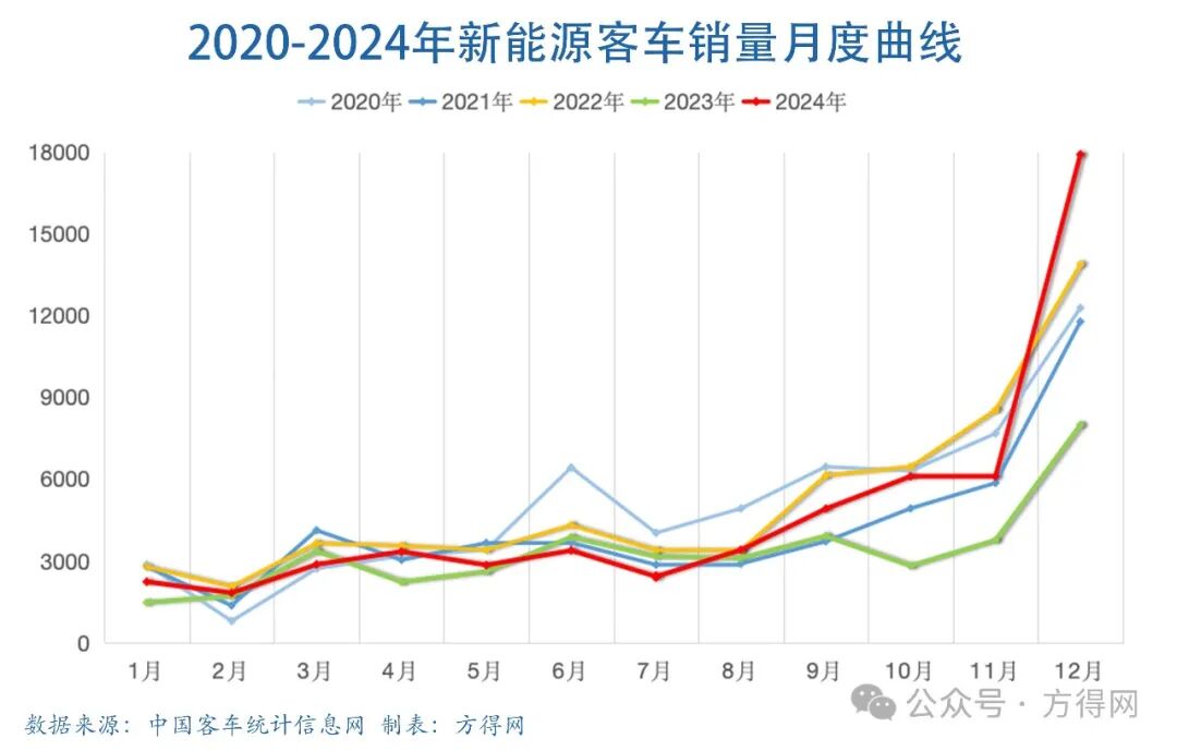 有了明确的实施细则、补贴标准、资金支持,市场快速激活。 中国客车统计信息网数据显示,行业重点关注的24家涉及新能源客车产销的企业销量总和,2024年10月、12月同比翻倍,12月更是达到了近18000辆,刷新近几年来新能源客车月度销量纪录!2024年行业共销售6米以上新能源客车57347辆,同比增长43.16%。