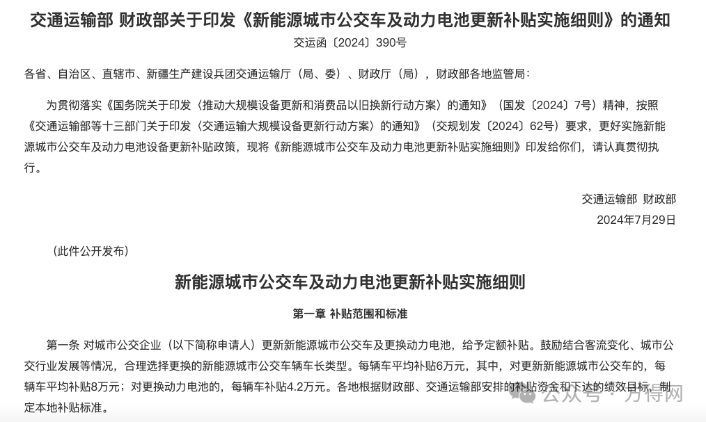 一系列政策“组合拳”,让整个行业相当振奋。而从新能源客车市场表现来看,2024年8月开始,推动作用才比较明显。 市场为什么是8月启动? 因为2024年7月24日,国家发展改革委、财政部《关于加力支持大规模设备更新和消费品以旧换新的若干措施》发布,进一步明确:更新车龄8 年及以上的新能源公交车及动力电池,平均每辆车补贴6万元。7月29日,交通运输部、财政部印发《新能源城市公交车及动力电池更新补贴实施细则》,支持车龄8年及以上城市公交车车辆更新和新能源城市公交车辆动力电池更换。其中,对更新新能源城市公交车的,每辆车平均补贴8万元;对更换动力电池的,每辆车补贴4.2万元。